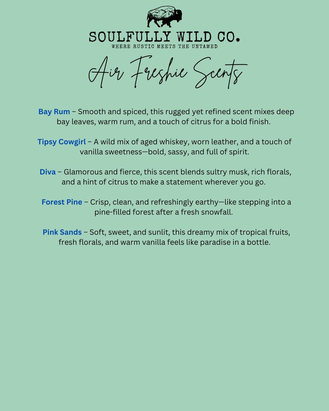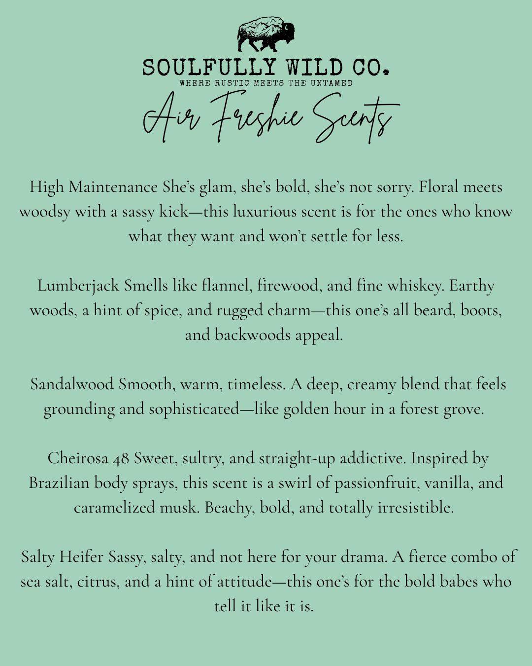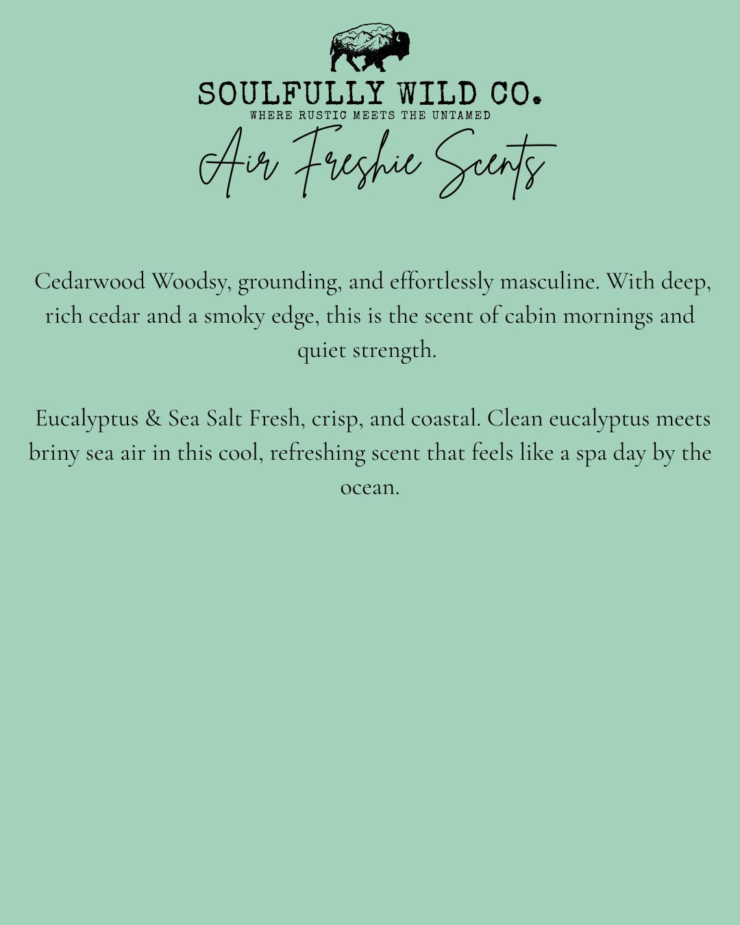 It’s a little burst of vibe and fragrance designed to hang wherever you need a lift — your car mirror, closet knob, studio space, or anywhere you want to feel a bit more you. Think of it as scent meets spirit — rustic, bold, and unapologetically handmade.
