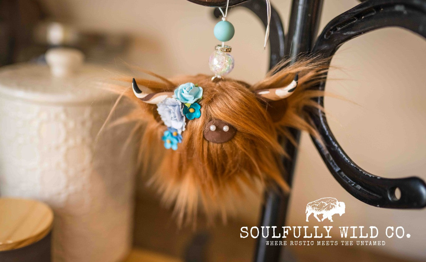Each Highland cow features hand-sculpted and baked clay horns, a soft faux fur coat, and a hand-stitched nose. Every detail, from the flower arrangements to the cowboy hats (when available), is uniquely designed and assembled, ensuring no two are ever alike.