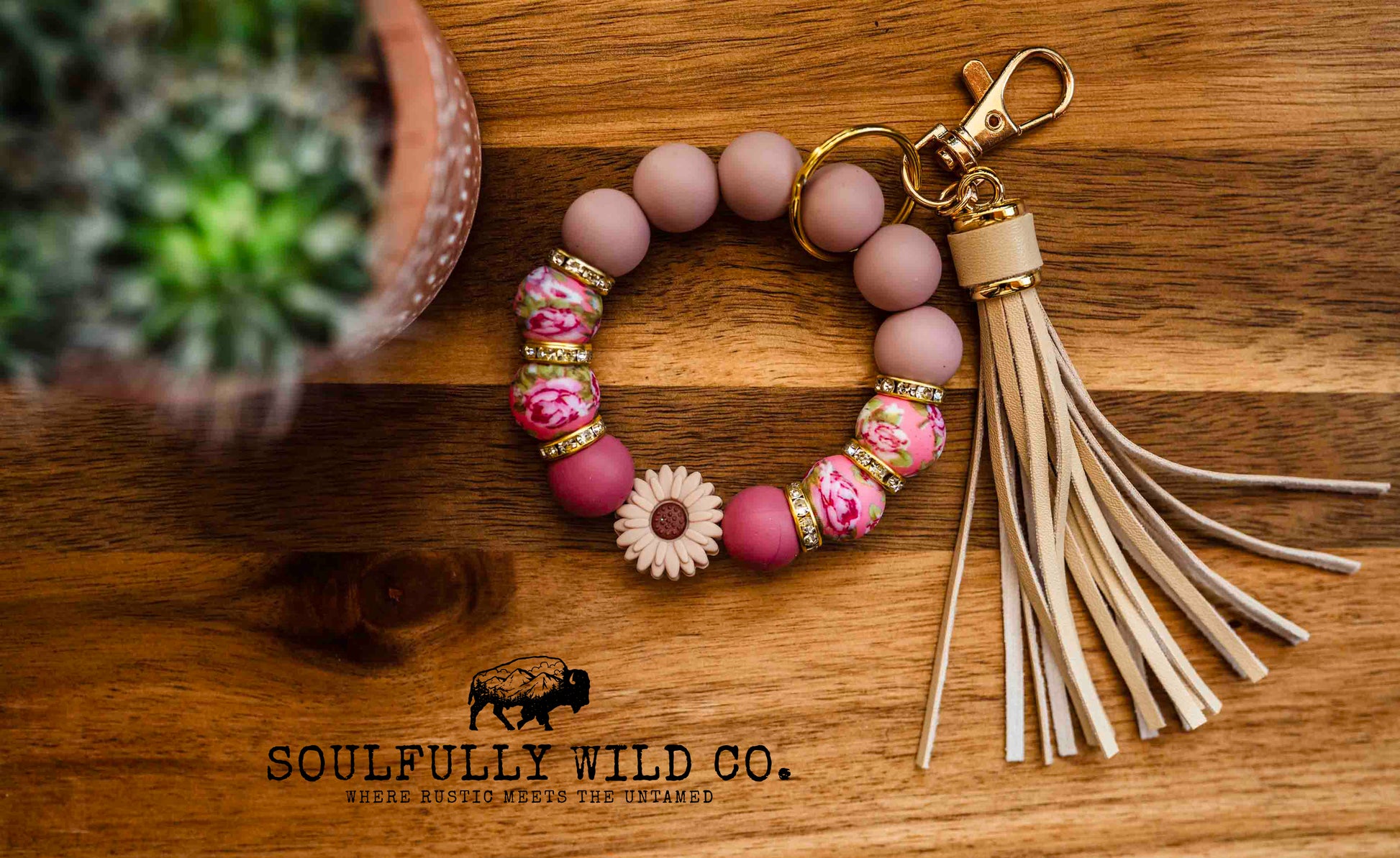 Wild Soul Keychain - Taupe, Tan, Pink, Flower print, Brown Flower Wristlet